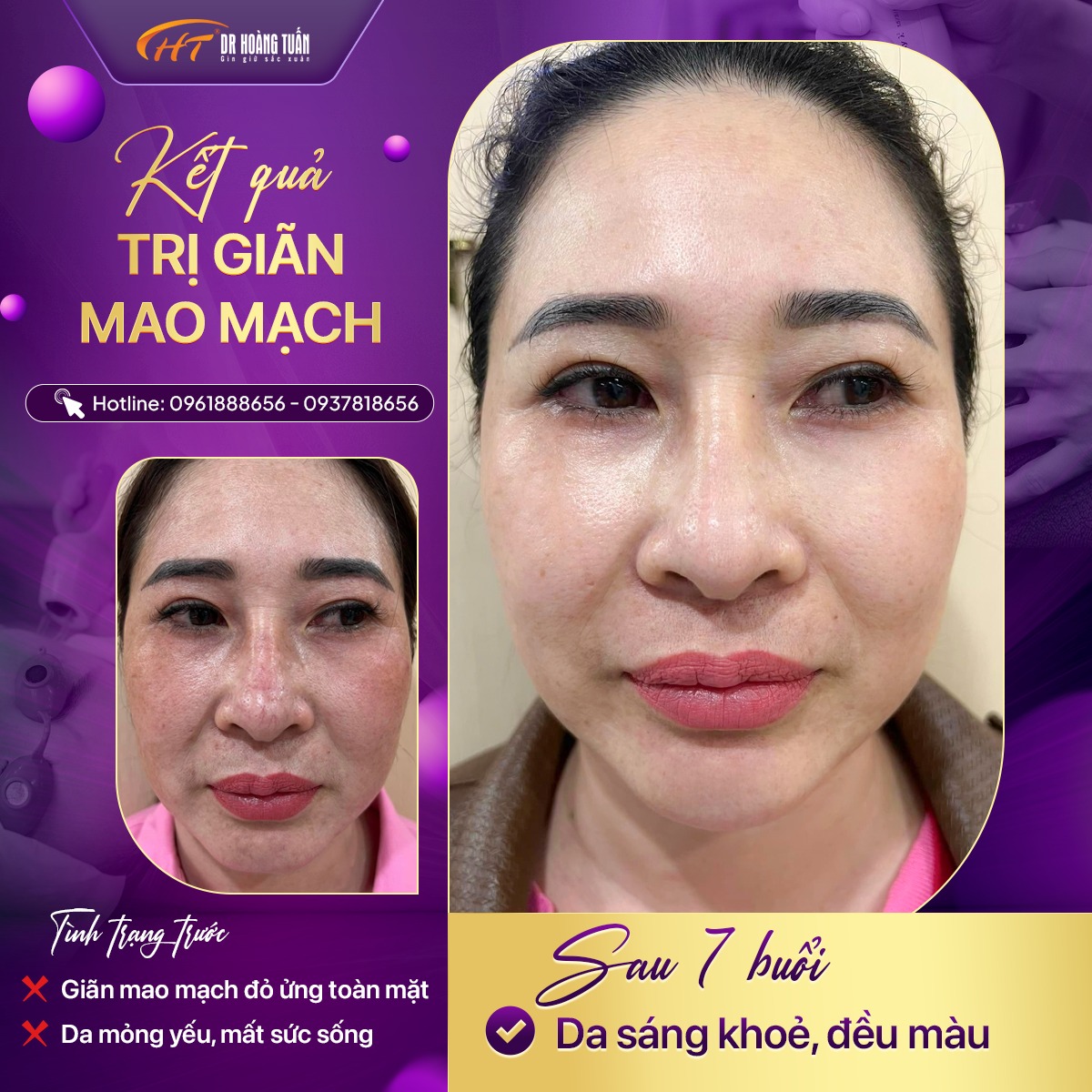 Bạn đang gặp vấn đề về giãn mao mạch ở mặt và muốn tìm hiểu về phương pháp điều trị giãn mao mạch vùng mặt, vui lòng liên hệ đến Thẩm Mỹ Hoàng Tuấn để được giải đáp nhanh nhất - Hotline 0961888656 - 0902858616 - 0942818616.