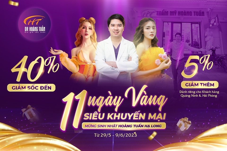 Nhân dịp sinh nhật cơ sở Hoàng Tuấn Hạ Long tròn 4 tuổi, Dr Hoàng Tuấn dành tặng quý khách chương trình khuyến mại – 11 Ngày Vàng Siêu Khuyến Mại Mừng Sinh Nhật Hoàng Tuấn Hạ Long hàng loạt ưu đãi PTTM đến 40%. ĐẶC BIỆT, giảm thêm 5% cho khách hàng đến từ Quảng Ninh và Hải Phòng. Chương trình chỉ áp dụng từ 29/5-9/6/2023. Tìm hiểu ngay!