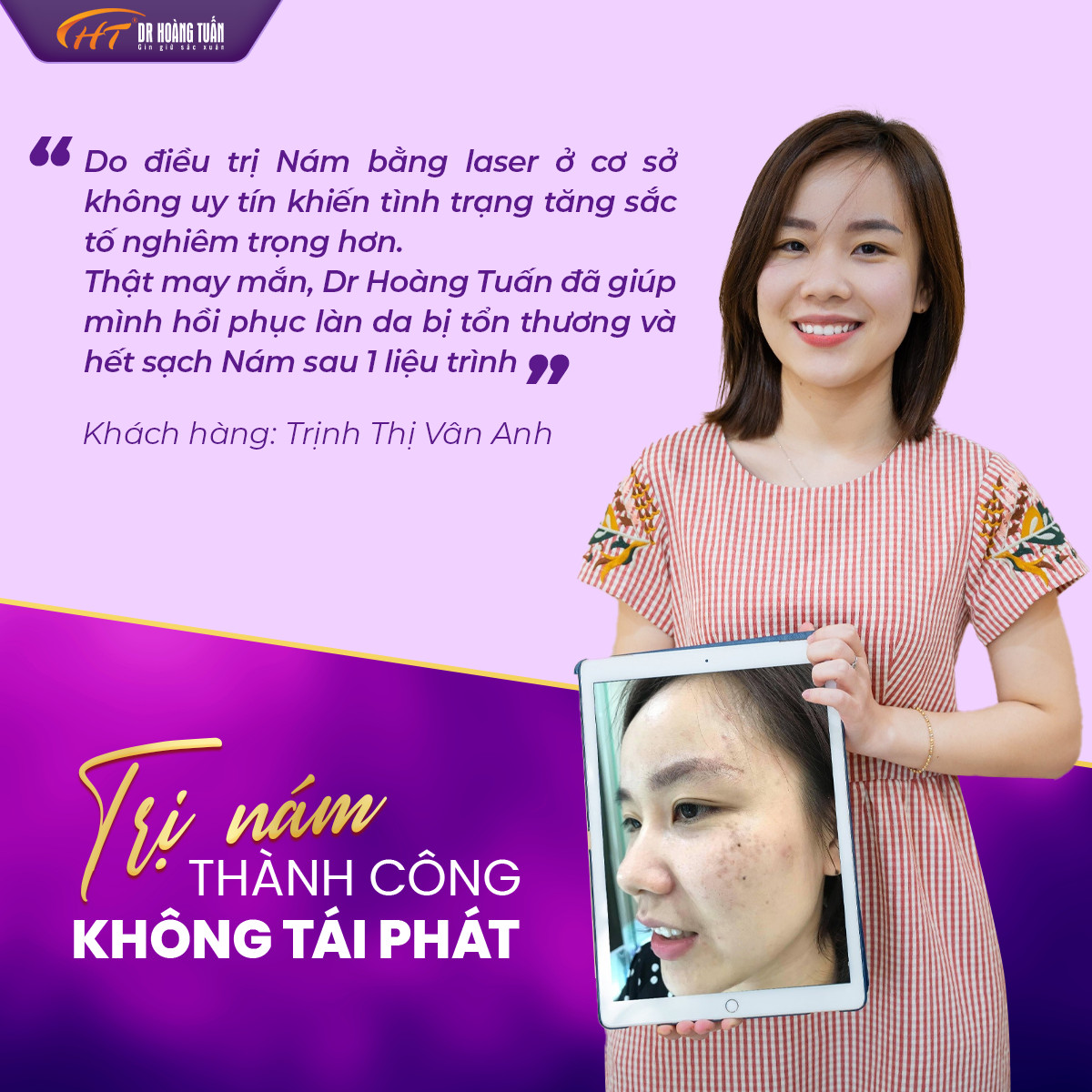 Thực tế đã có hàng nghìn khách hàng điều trị nám thành công bằng công nghệ laser tại Thẩm Mỹ Hoàng Tuấn. Tuy nhiên, tình trạng nám có tái phát hay không còn phụ thuộc vào nhiều yếu tố như: cách chăm sóc da, bảo vệ da, nội tiết tố, chế độ ăn uống, …