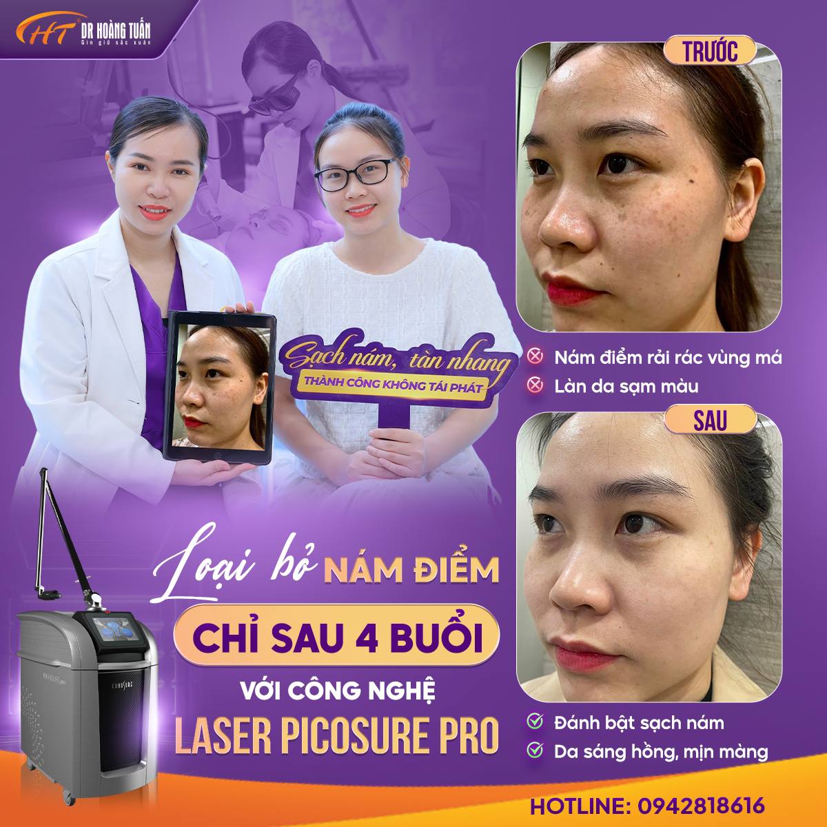 Thẩm Mỹ Hoàng Tuấn là một trong những đơn vị uy tín tại Hà Nội chuyên cung cấp các dịch vụ chăm sóc da chuyên nghiệp, trong đó có liệu pháp trị nám với bộ 3 siêu công nghệ đến từ Hoa Kỳ: Laser Picosure & Picoway & Picosure Pro đã giúp cho hàng nghìn khách hàng tự tin hơn với làn da không còn nám.