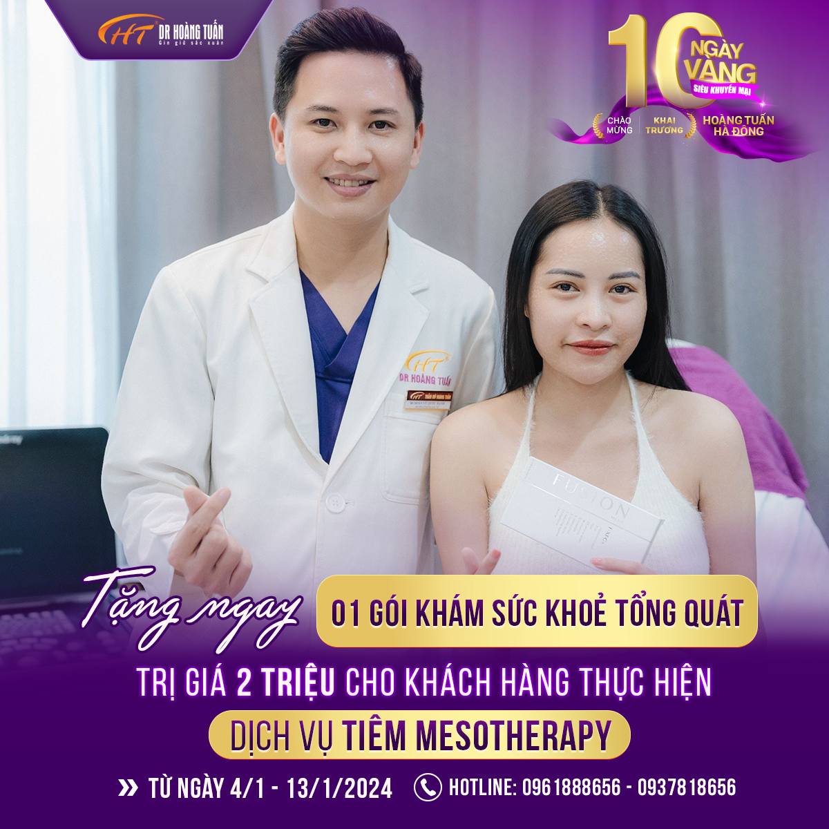 – Tặng ngay 01 GÓI KHÁM SỨC KHOẺ TỔNG QUÁT tới Quý khách hàng đăng ký sử dụng dịch vụ cấy tinh chất Mesotherapy tại Dr Hoàng Tuấn từ 4/1/2024 – 13/1/2024