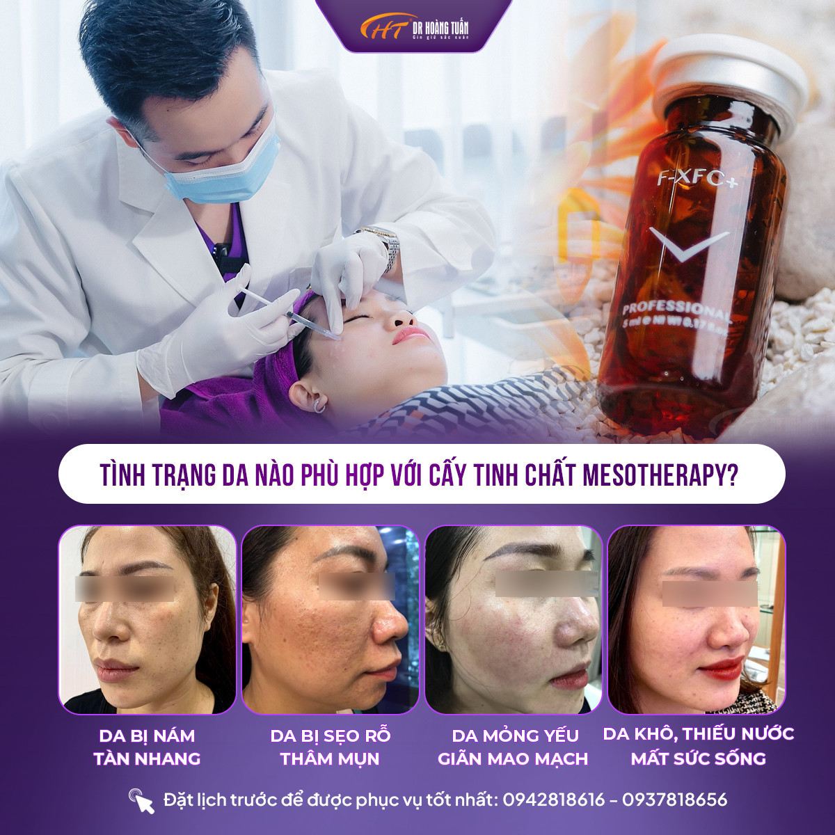 Đối với dịch vụ tiêm meso căng bóng, trẻ hóa da, Thẩm mỹ Hoàng Tuấn đang sử dụng tinh chất trẻ hoá da F-XFC+ có nguồn gốc xuất xứ từ Tây Ban Nha, giúp da căng bóng, khỏe đẹp và đều màu tự nhiên.
