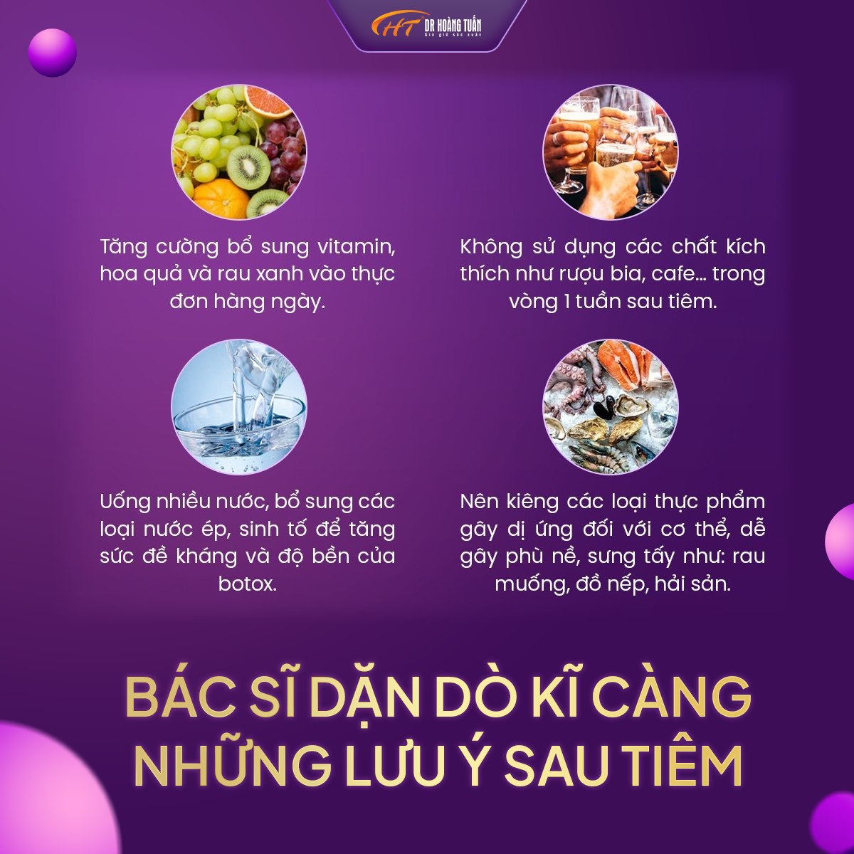 Trong 24h sau khi tiêm, không dùng sữa rửa mặt, nước tẩy trang bởi các thành phần có trong sản phẩm này có thể ảnh hưởng đến chất lượng của botox;